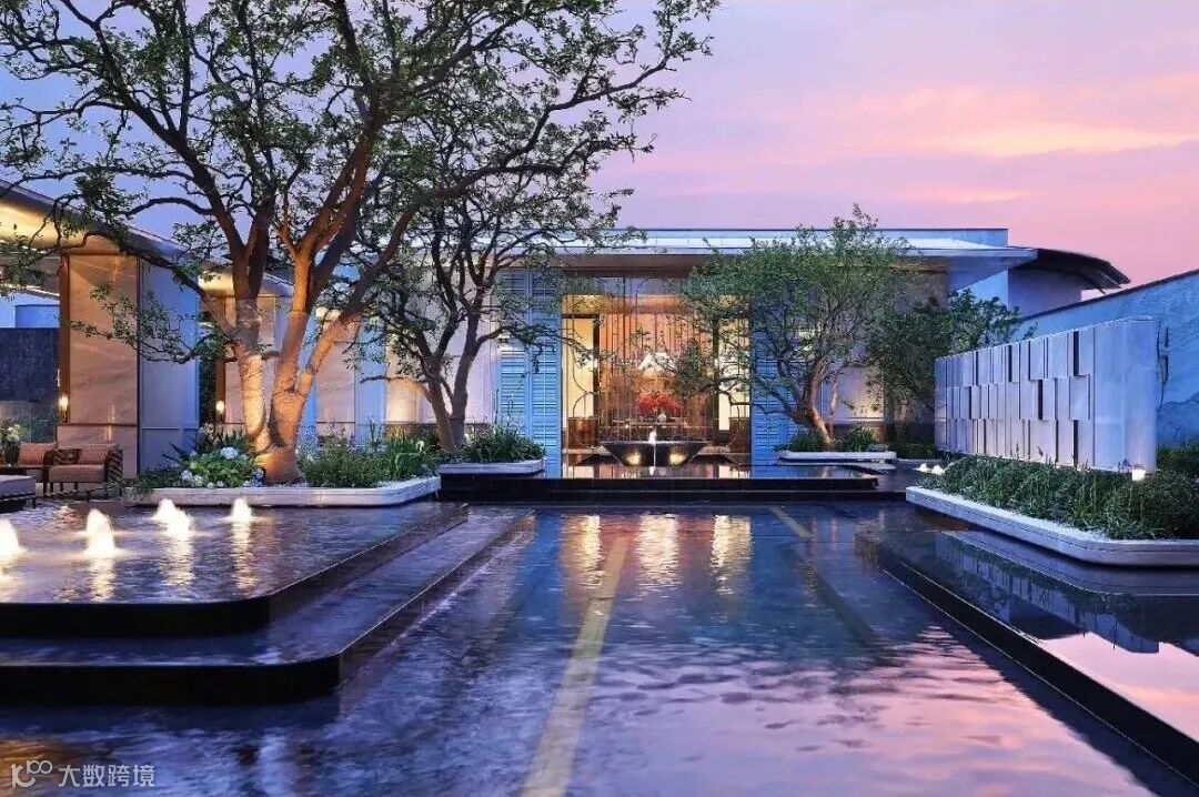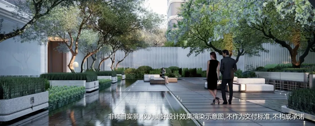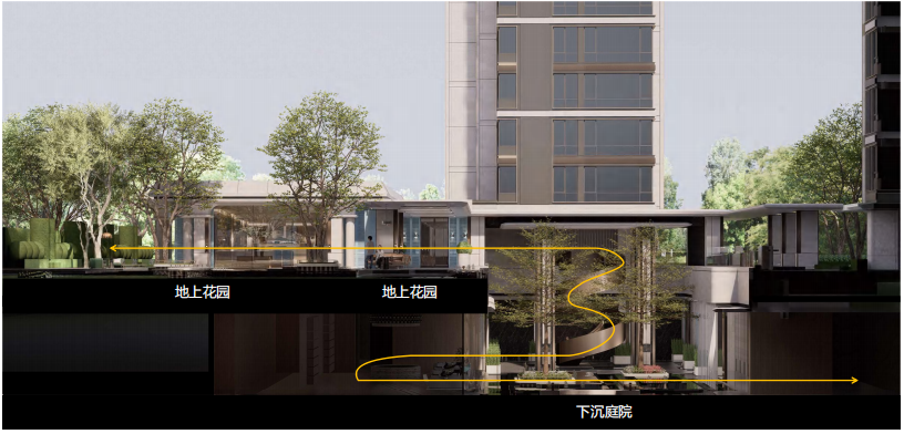 项目景观打造下沉庭院,以约6.15米高的悬挑水帘、水中下沉卡座,构筑行走于水上的通行体验,与地下配套用房对话。地上地下的双园驱动,以直径约2.5米的雅典黑金花水钵为起点,以直径约2米的黄金麻整石水钵为终点,通过金澜线条的延续,串联景观故事线,回应湖映金沙的营销价值。