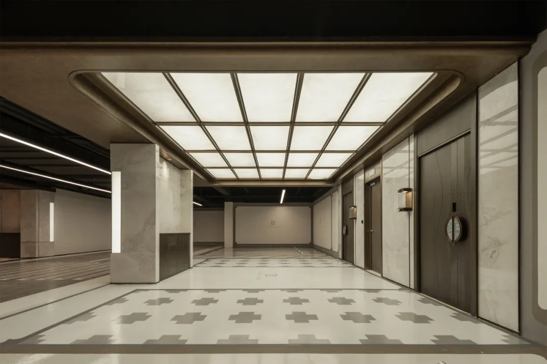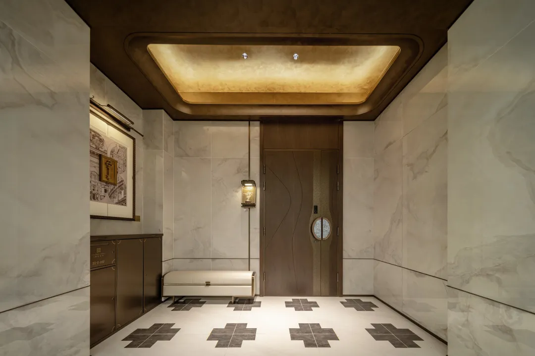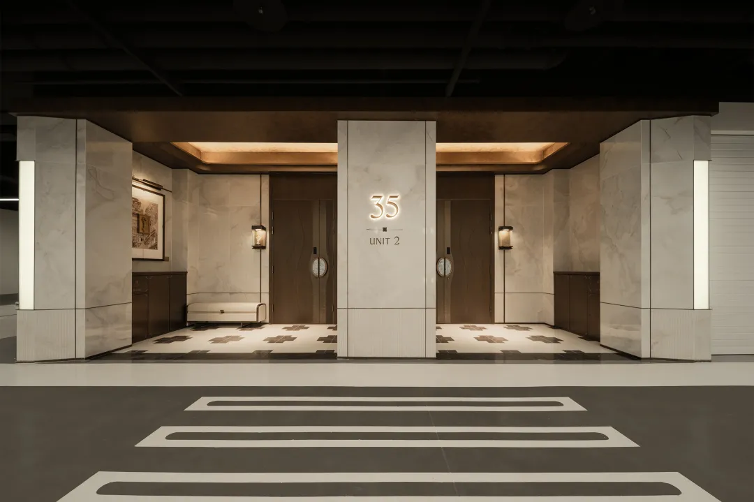 更精妙之处,在于对生活细节的极致打磨。叠墅不仅配置光厅与独立电梯入户,更将门牌以定制壁龛呈现,通过艺术化造型,彰显居者的独特品味与个性主张;立面则巧妙融入独立信报箱与快递存储柜,在保障私密性的同时,实现功能与美学的完美融合。