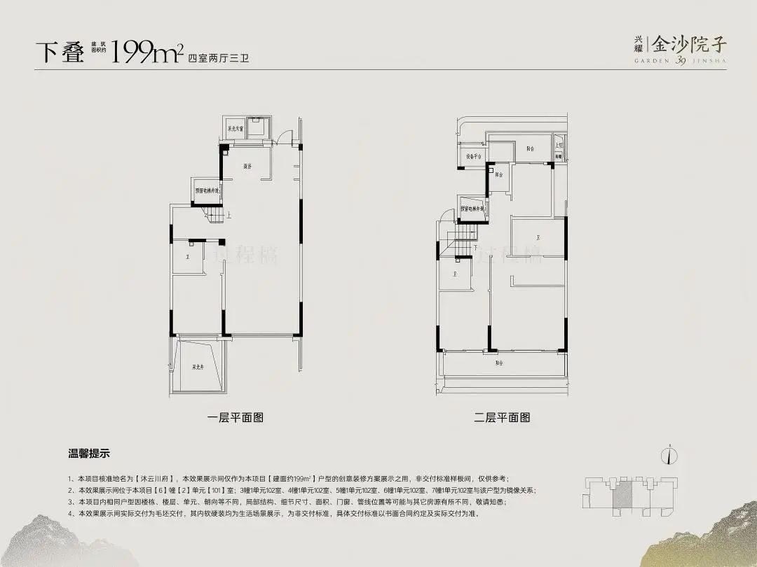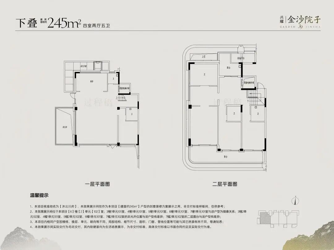 金沙院子,兴耀首个超级院墅,上下双叠。上叠面积255方,下叠约245方,最小花园115方。