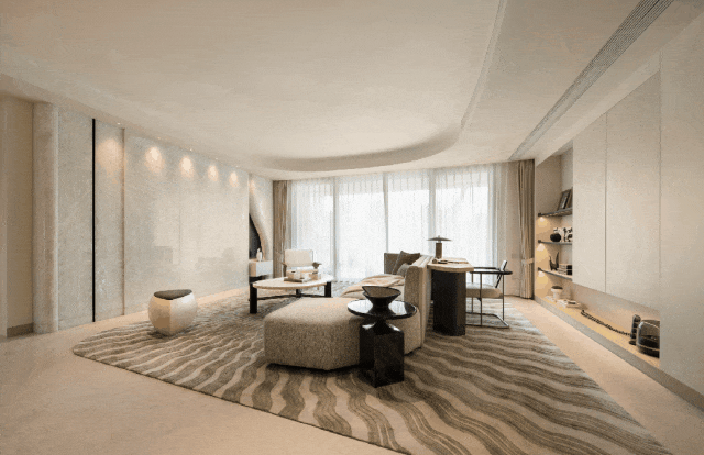让空间更多地向风景打开,且与当代家庭的日常栖居结合,每一层都勾勒出独特的生活场景。边套约10.2m的开间,L形露台设计,勾勒270°景观视野。三楼卧室层的私密优雅、四楼餐客厅层的社交开阔、五楼的云端闲逸,上下之间,雍享天地,构筑一个兼具仪式感与舒适度的理想居所。