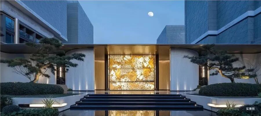 项目大门内外两重门厅景墙运用月光米黄石材近1000 方,搭配香槟金金属线条,汲取爱马仕全球旗舰店的双曲面叠墙造景手法,增加景墙奢华质感。