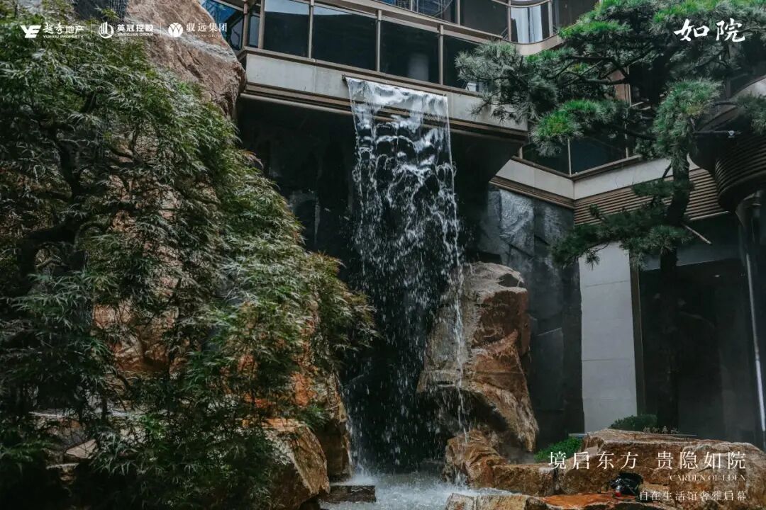 景观中庭的设计是市面上极为少见的三层观景式设计,以北宋画家范宽的《溪山行旅图》为范本,叠石、壑松及高低落差约15米飞瀑,亭台楼阁、檐下的游廊、小桥流水相互映衬,宛如一幅山水画卷。