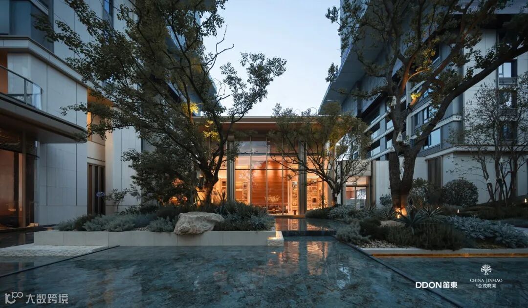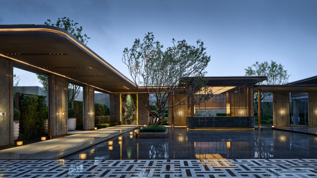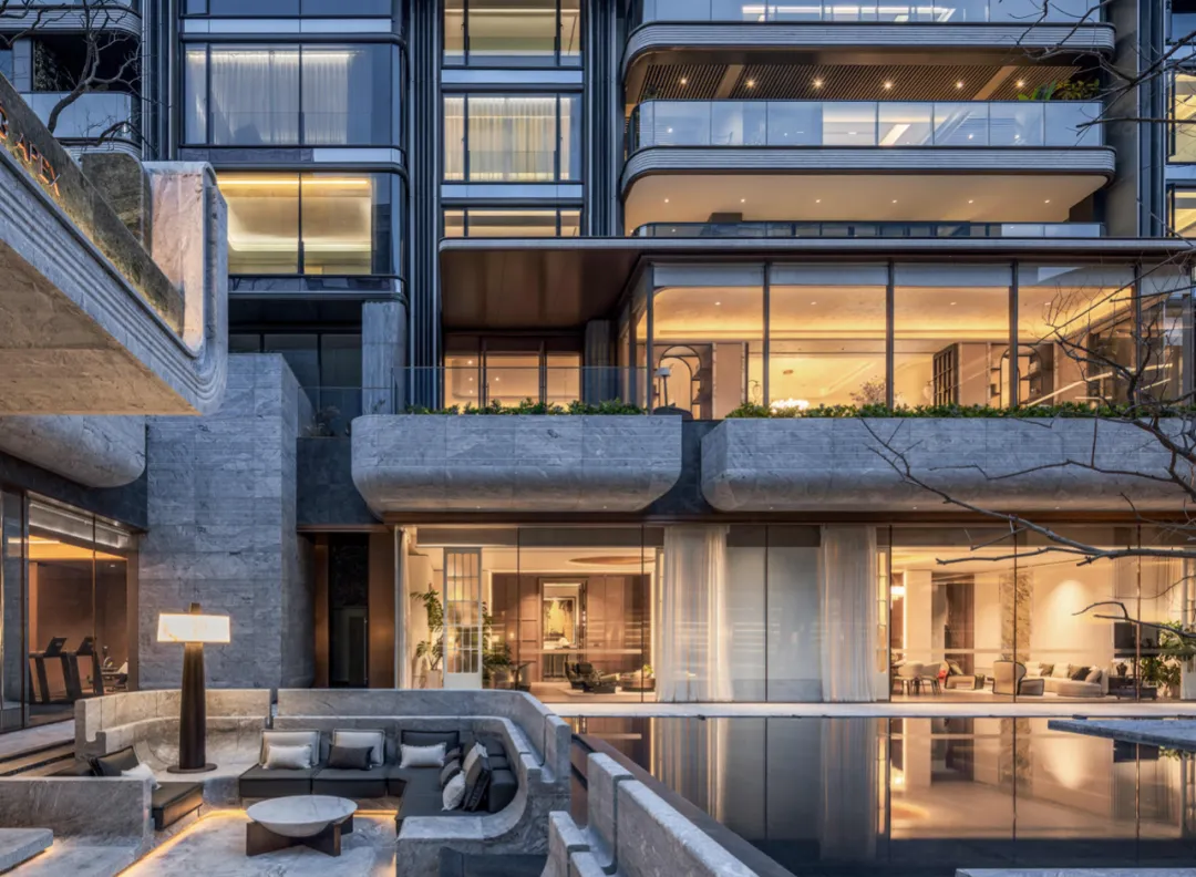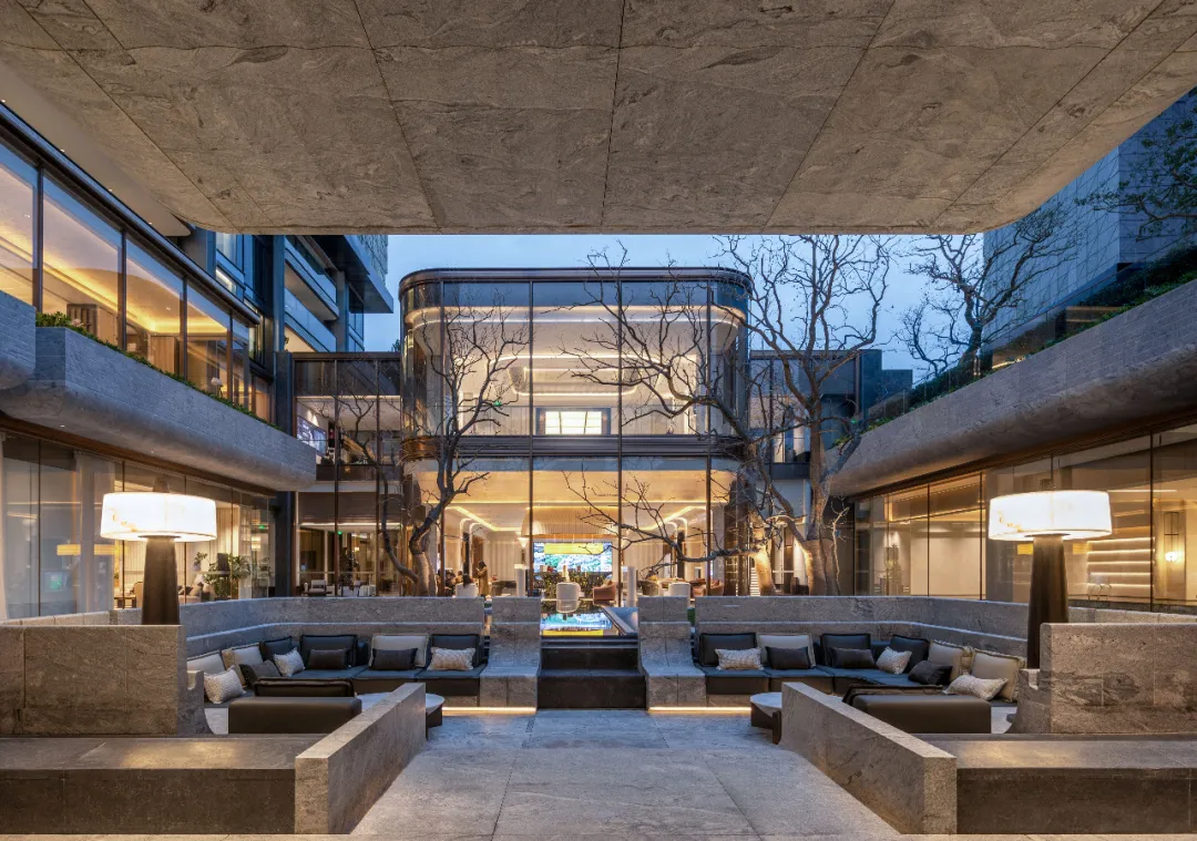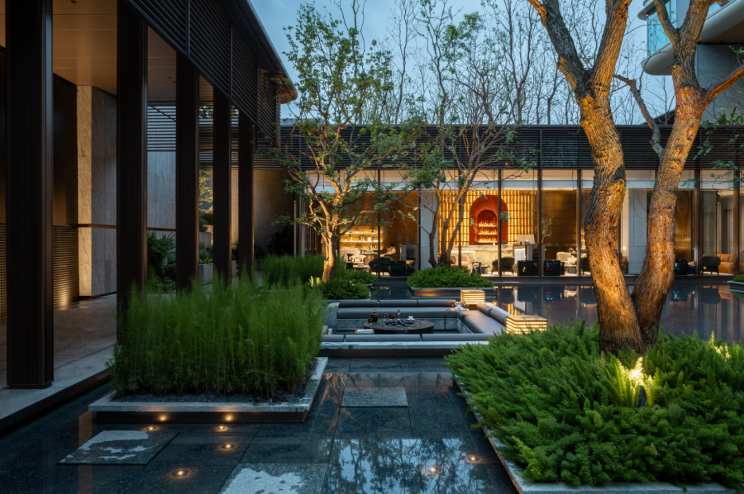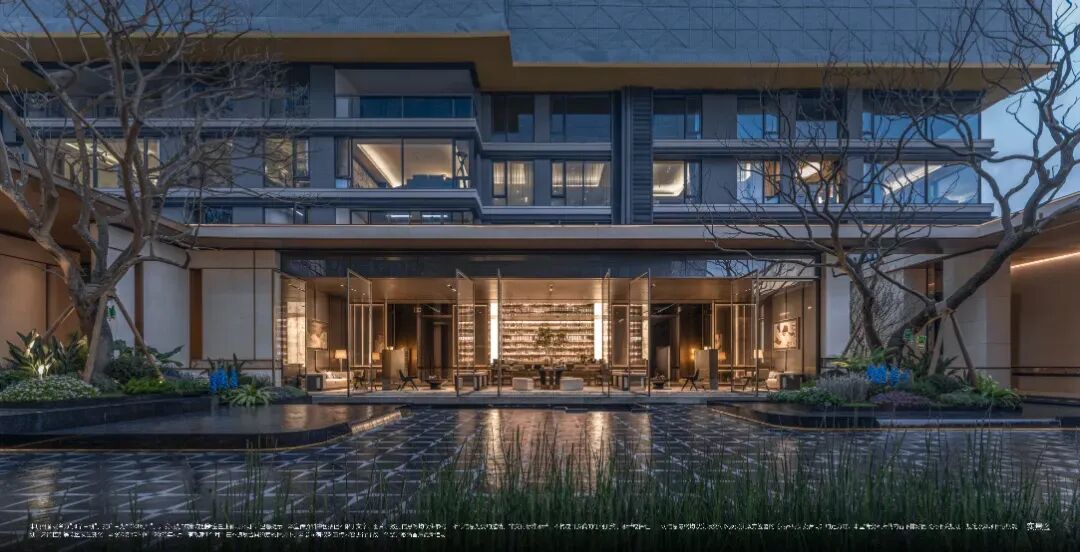下沉式庭院,巧妙运用层级叠水景观,尽显精致奢华与优雅气质,营造出鲜明的空间领域感。