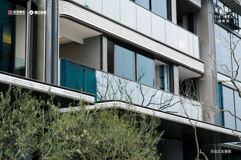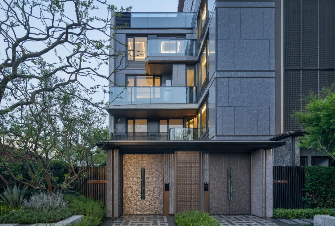 外立面采用现代风格打造。灵感汲取于古风雅韵融合现代美学。外立面取瘦金风骨,以宋冠翅帽檐+玉带铝板雨棚+全景落地窗建东方美学,打造横向韵律、直角线构的隐奢极简艺术。