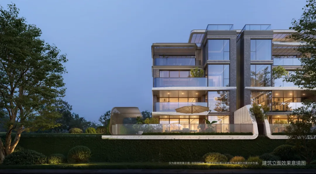 洋房建筑立面延续了“弧形倒角+类幕墙”的设计语言,将三圣乡万亩景观装进360度的环幕大屏中。