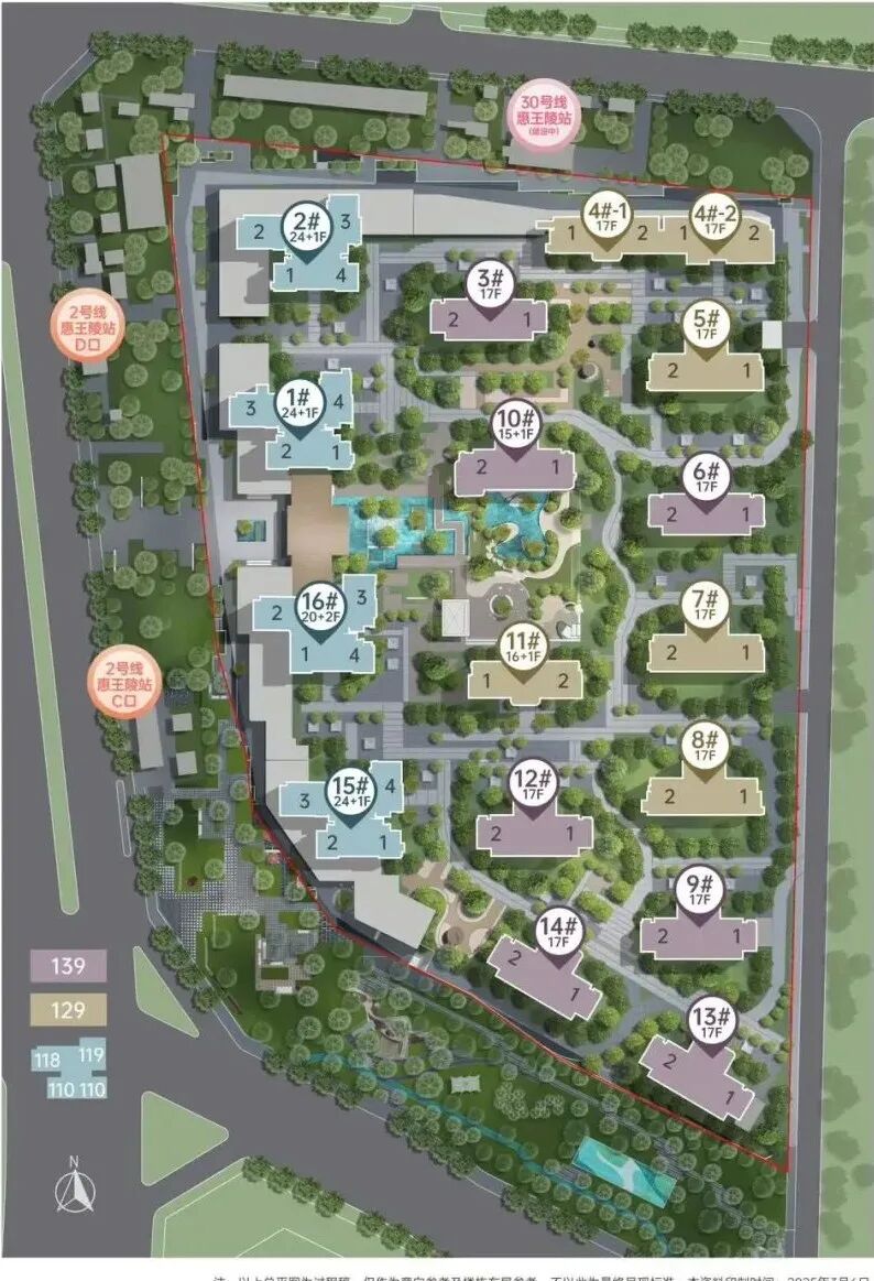 63亩的项目,2.5的容积率,规划了16栋17F—25F的小高层/高层产品。建面约120平米以下的清水产品为2T4户塔楼布局,建面约129平米和约139平米的精装产品是2T2户板楼布局。