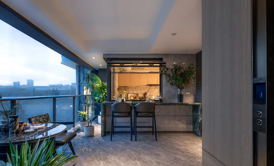 大跨度梁柱设计&非承重推拉门框设计,让内凹庭院和景观阳台联动,形成开阔的L型包裹式全景庭院。模糊建筑与景观的边界,自带城市度假感。