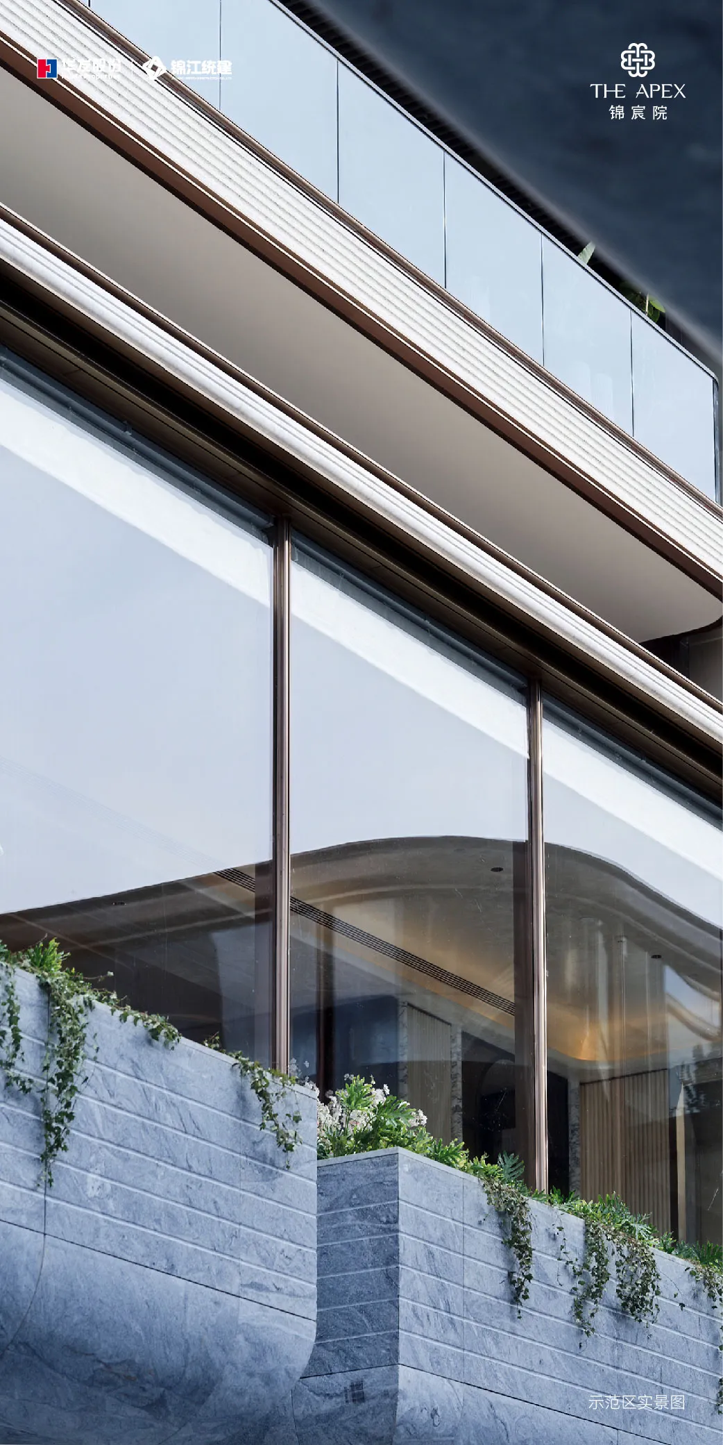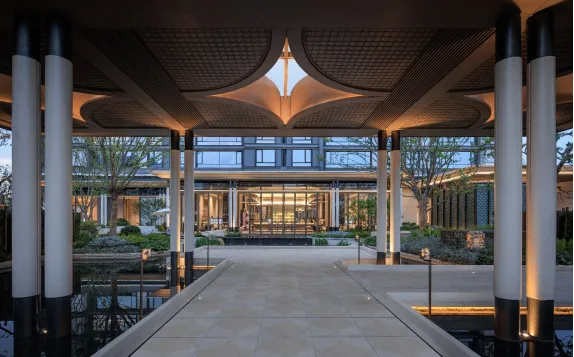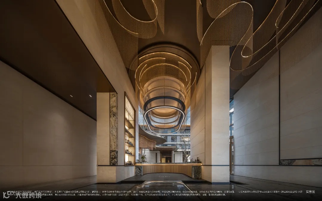 项目延续了重奢和艺术的设计语言,对标安达仕酒店对称式设计美感,定制了长达75米的超级社区大门。6.5米高的超级界面,搭配「锦纶华盖」艺术天幕、「玉踏锦宸」十级琼阶、「金玉满堂」景墙,让门庭交织文化与礼序,赋予入口恢弘的气势。