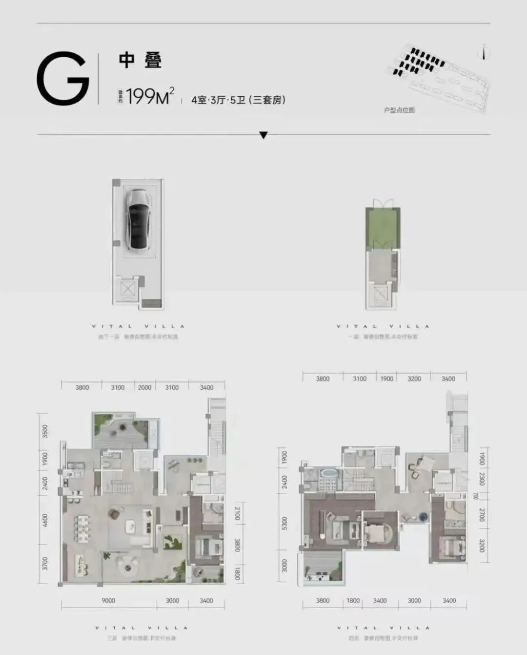 约199㎡的中叠户型,中叠拥有7个花园空间,:1F入户花园;叠下4花园;叠上2花园。