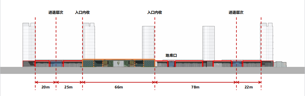 项目东侧为城市Image Mark界面,在这条150m长的烟火生活街上,打造了将近66m宽的极致庄重礼序的社区大门,寓意“金玉满堂”的门廊。