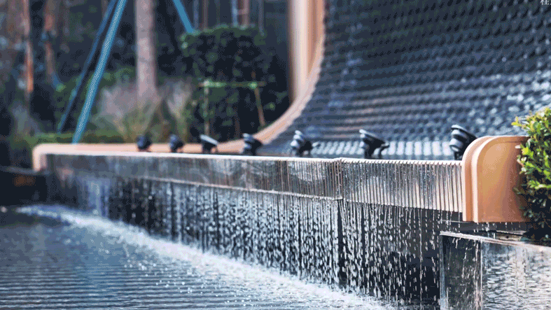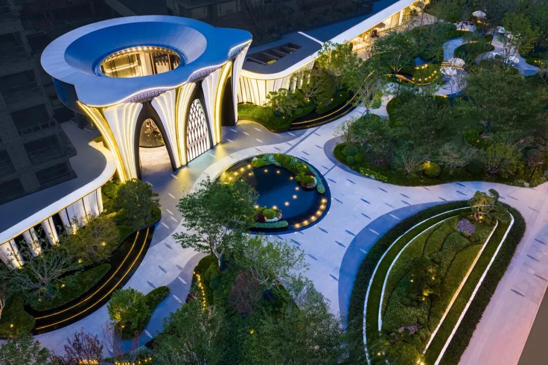 项目利用总抬高约5.7米、净高约4.1米架空层,将“立体感”“垂直感”赋予景观设计中。鎏亭、叠瀑、流瀑水院……自然融合,让人美不胜收。