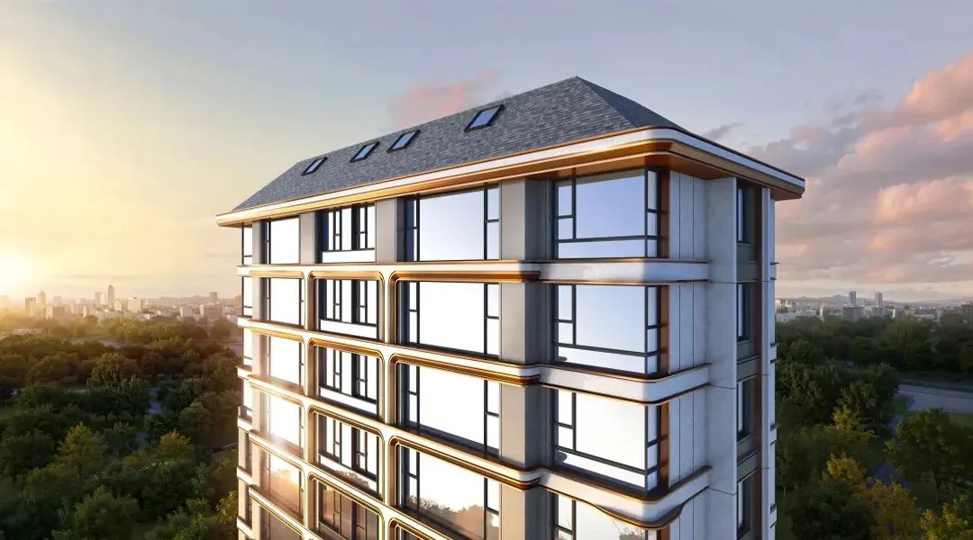 产品风格整体采取了更具有现代感的表现形式,注重表现虚实对比关系,材质的肌理关系,以公建化模式、色彩交织的线条强调立面形象与标志感,由银灰色、香槟金颜色构成,呈现时尚美学的风情与活力氛围。