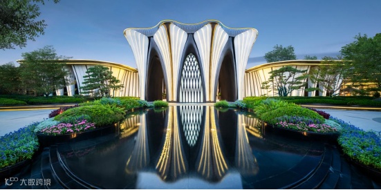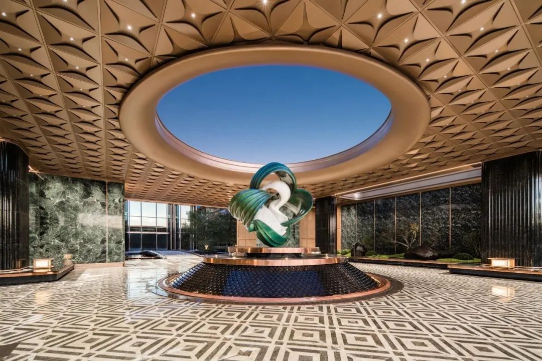 入口以层叠双曲面打造金色叶片,截面变幻如生命勃发,镜面不锈钢与光影共舞,将自然万象凝练为当代奢雅符号。