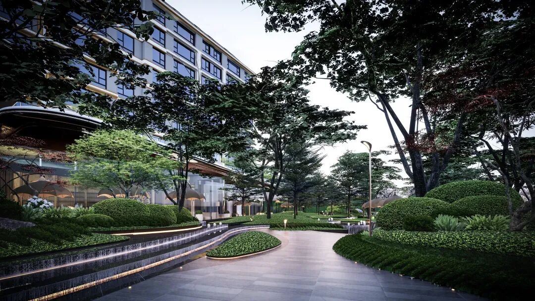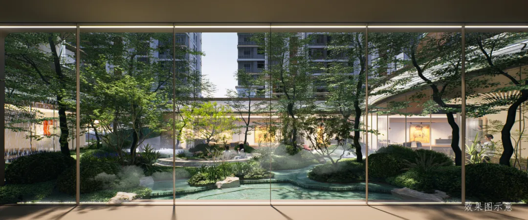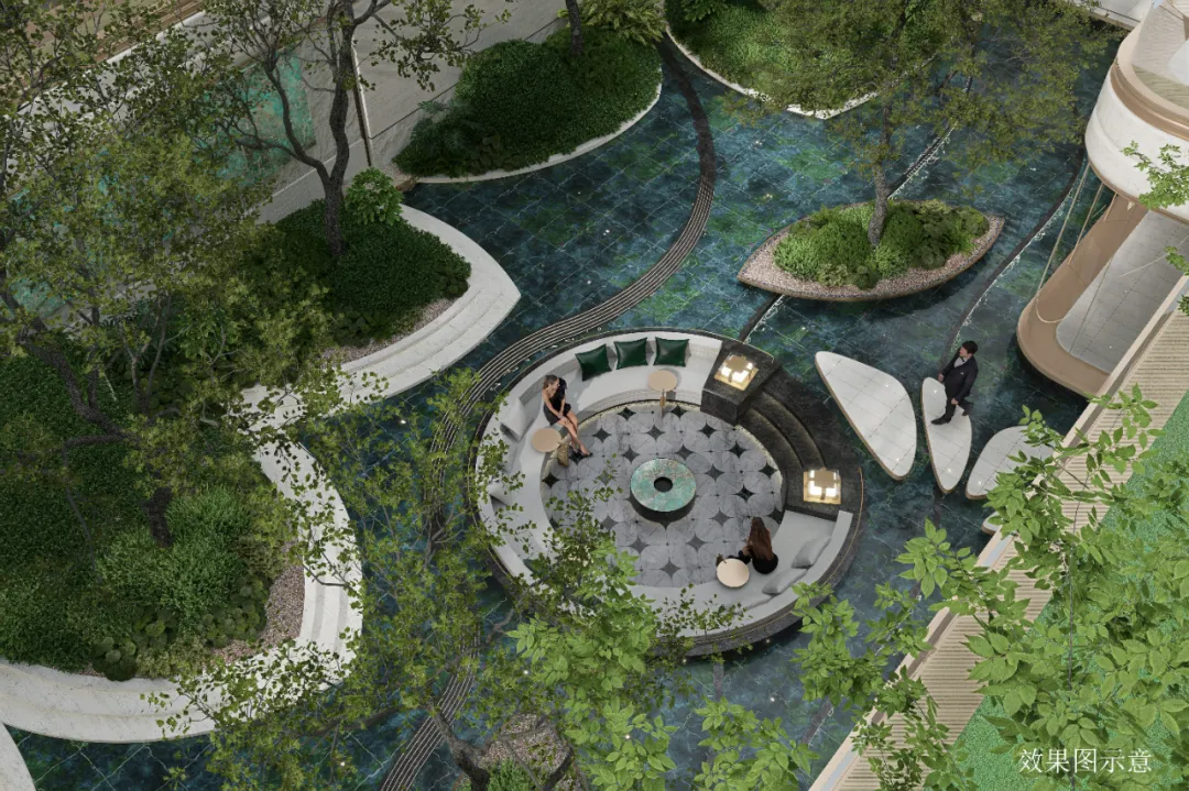 架空平台下,结合下沉庭院、打造奢隐的私家社区生活组团,融合山川河岳的东方园林与私家会所空间,形成生态自然的社区活动空间。