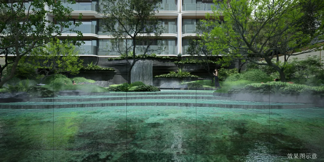 项目打破传统平面布局匠心构筑最高约8米台地立体园林。精心打造约600m下沉层叠水庭,引用斯卡帕艺术技法,整石铺就亚马逊绿奢石。