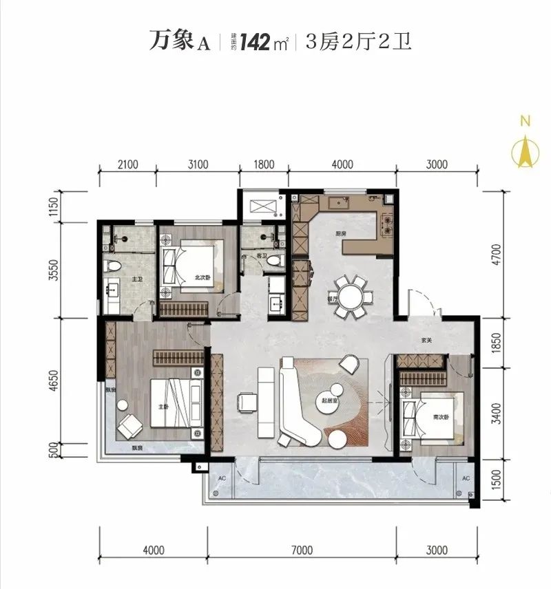 建筑面积约143平米户型:扁平化设计塑造13.8米南向总面宽,7米巨幕式客厅打造家庭核心社交场域。独立入户电梯厅延伸私密空间,16平米全景阳台串联客厅与次卧,以“全面屏采光”重构居住尺度,让每一寸空间承载生活的自由与诗意。