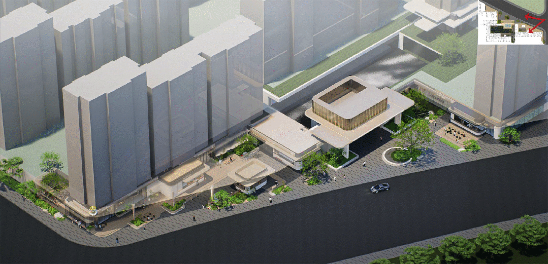 也因此,北侧打造出了宽檐商街,以口袋公园、棠果盒子商业、奢阔门庭组合成超级界面。