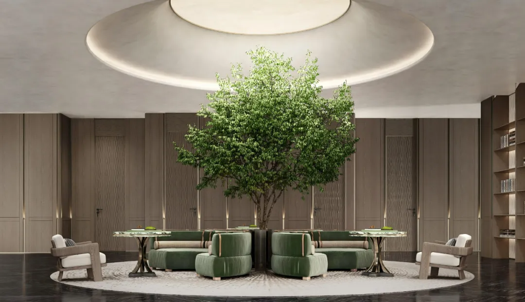 一个半开放的庭院空间作为迎宾庭院,空间与景观及装饰呼应玉兰主题元素两侧兼顾一些对外的配套功能,同时作为进入社区大堂的缓冲空间。