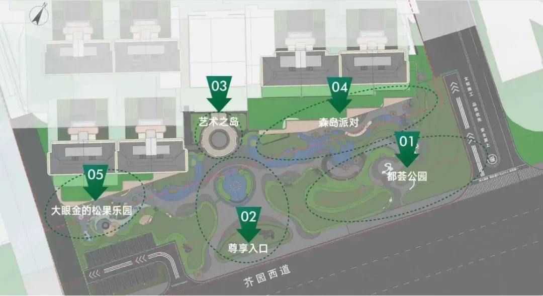 五大主题场景都荟公园-尊享入口-艺术之岛-森岛派对-大眼金的松果乐园,约6500㎡度假级景观公园,实现先入园再归家的生活体验。