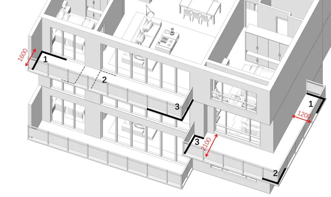 在细节的把控上,竖向构件采用了梭形的截面形式,结合端头的型材与侧向铝板,让建筑形体更加挺拔,阳台部分则采用宽窄两种细部截面处理,搭配灰色玻璃栏板,两层一组,去弱化阳台的体量感。飘窗部分也是两层一组,宽窄相间的截面处理,弱化飘窗在纵向上形成的体量感。