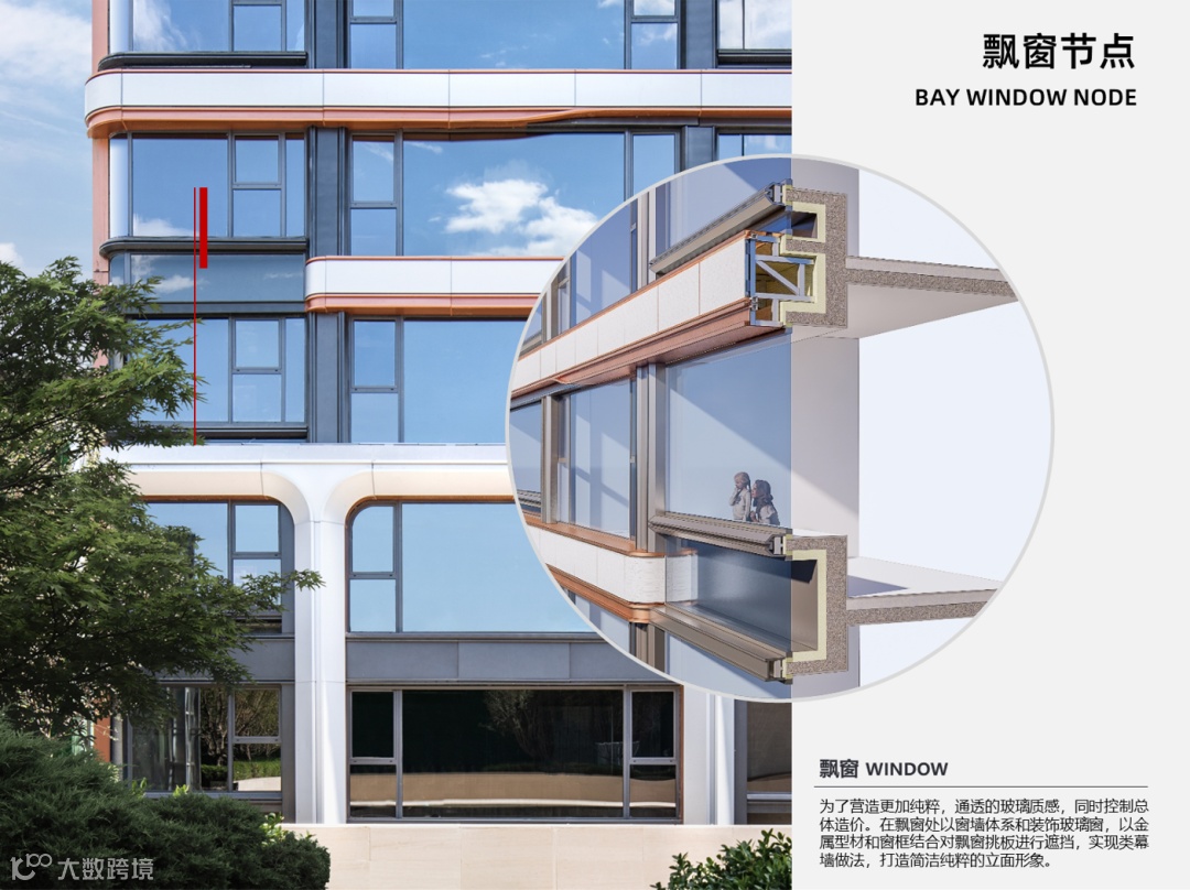 比如,杭州融创·涌璘府在飘窗外立面节点处理上,飘窗上下两部分均采用窗系统,通过简洁的变截面铝型材,实现上下窗扇的平顺交接。节省材料用量的同时,既不会影响立面效果,也能保证气密性和水密性,提高门窗的整体保温效果。