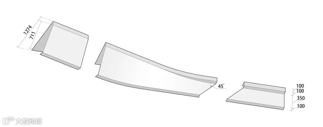 设计团队通过模数控制对构件进行梳理:玻璃栏板,扶手,铝板等不同材料进行对缝设计,玻璃栏板划分间距1.5m,一块玻璃栏板对应一块铝板,进行标准化设计;调板弧线尺寸、弧面玻璃倒角尺寸进行统一,弧形挑板被进一步拆解为,收边型材,上斜面,下斜面,弧形转角等构件,进行模块化分解。