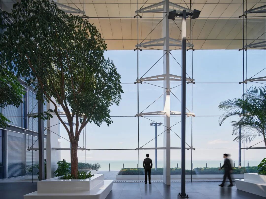 One particularly spectacular feature is the energy-efficient double skin facade design with high-transparent glass, which from the inside provides office workers with unobstructed views of the coast and downtown area and, from the outside, proudly showcases the building’s structure—clean, slender, yet very robust. None of the pillars interrupts the spacious sky gardens that rotate every four levels, allowing the volume of the other four floors above to cantilever up to 14 meters. This is achieved through mega-bracings that minimize the lateral deflection of the structure and provide a feasible solution for strengthening earthquake resistance.