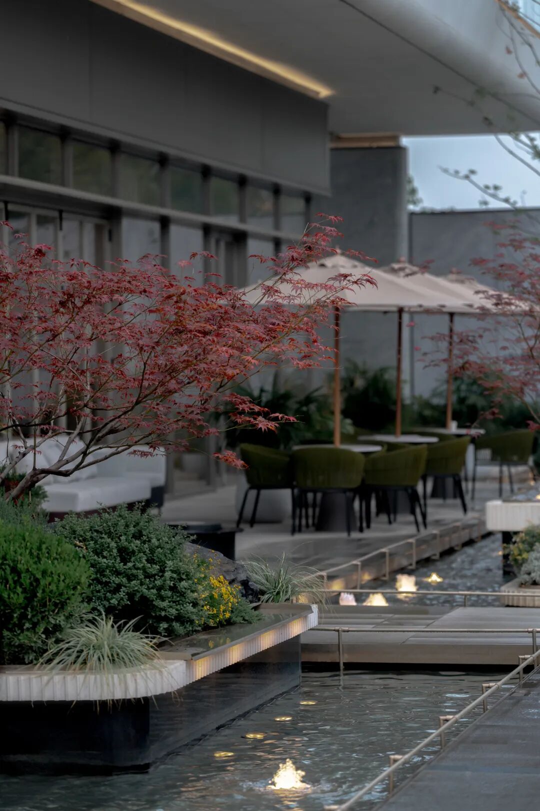 镜面水景与4株高大造型乌桕相互呼应,增强了景观的流动性和园林的“漂浮感”。在简约而富有深意的构图之中,自然的韵味悠然弥漫。
