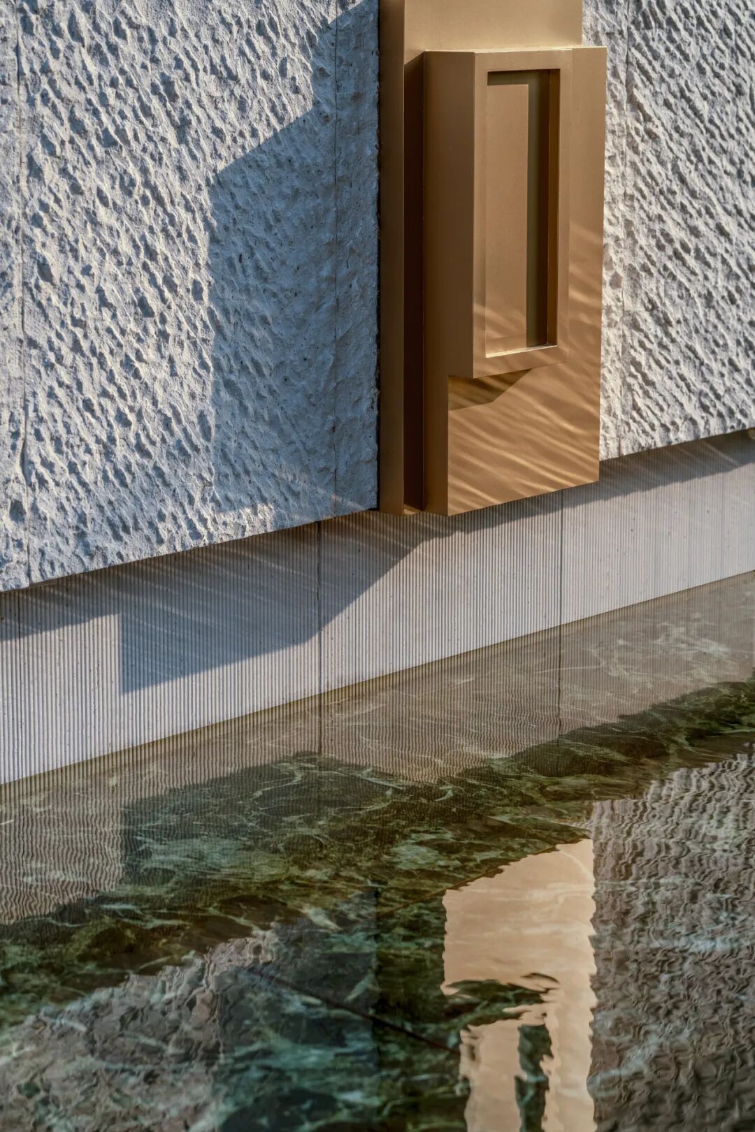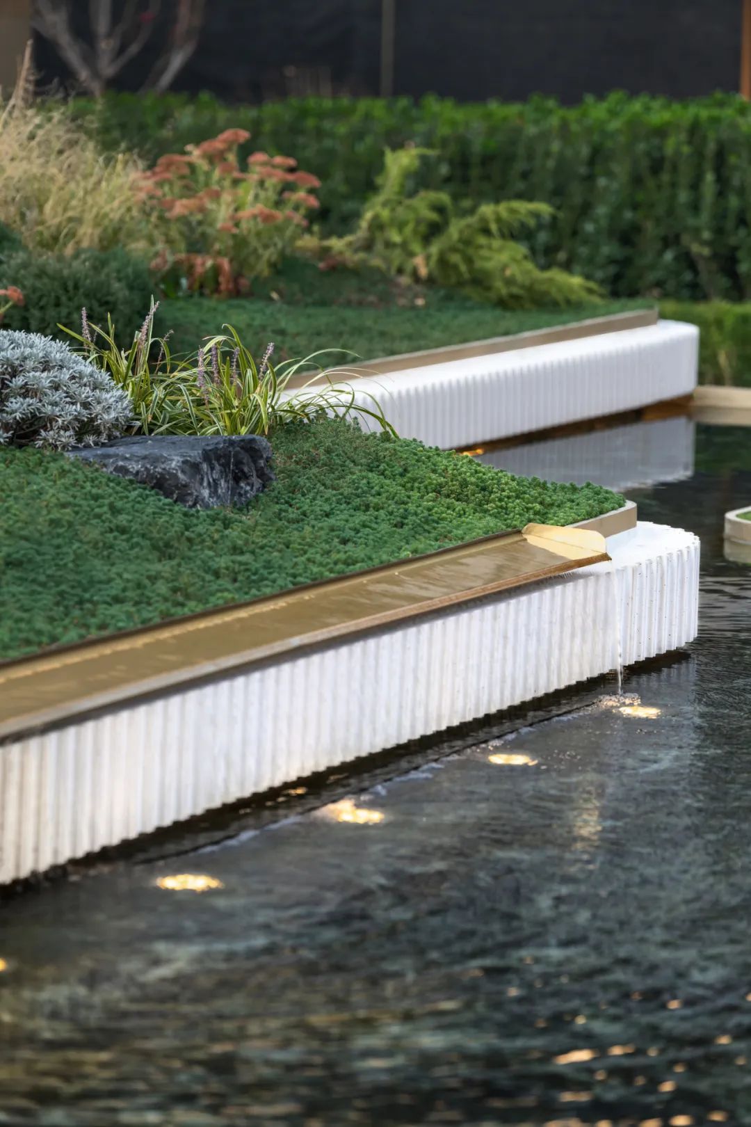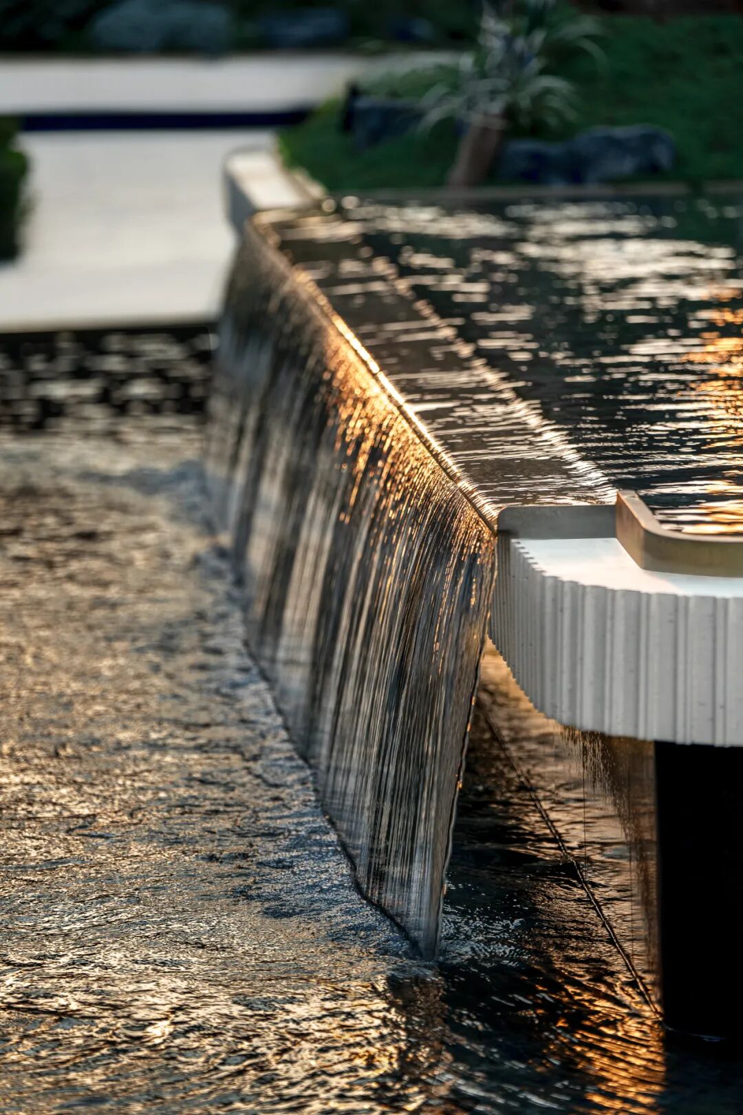台阶处的“叠水”横向铺展,递层下流,呈现坠落之美。不同叠水更追求水流的层次感,打造错落有致,水声潺潺,水光潋滟的景象,落下的水幕演绎一幅幅动态画卷,带来灵动的视觉感受。