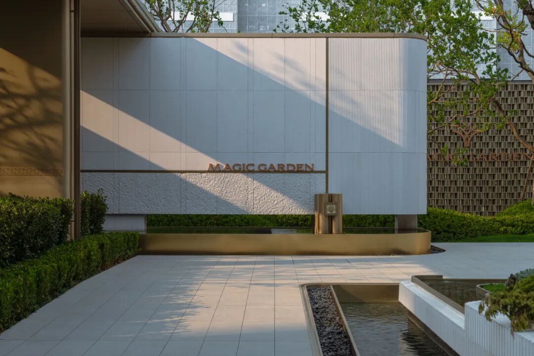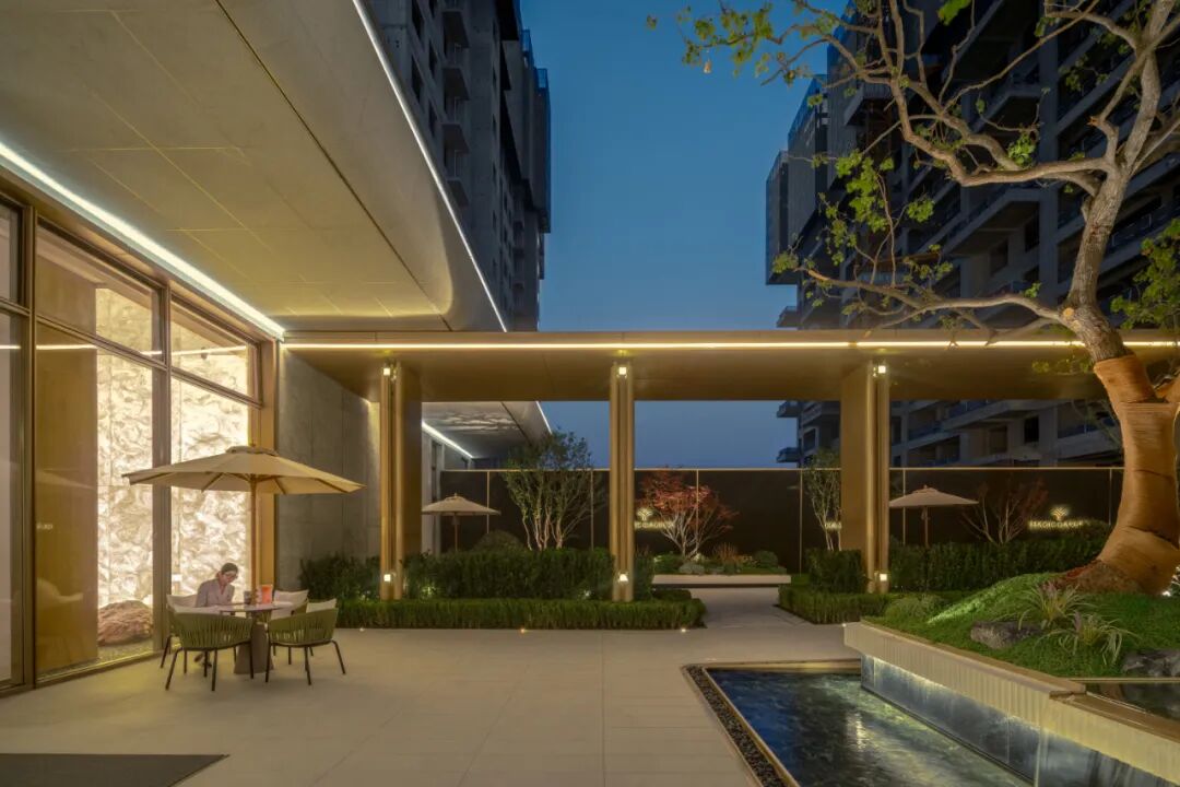 园中之院作为归家首景,以开门见园象征从繁忙的外界进入到一个安静、和谐的园区环境。我们最大限度地使场地拥有干净场景,宛如一位优雅的引路人,悄然退至幕后,将广阔的舞台奉献给光影的交响。
