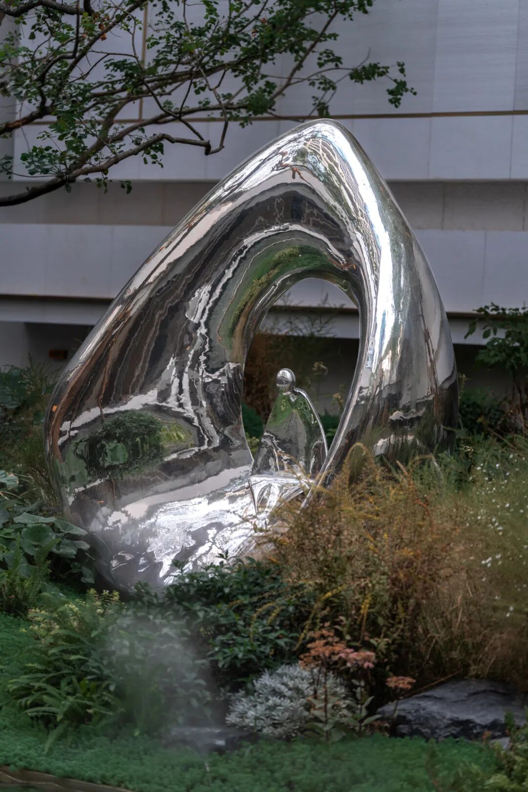 太湖石雕塑汇聚了行人视线,漏、瘦、透皆具,目之所及,独占风姿。静静远观,仿佛陷入了与时空的对话。两株紫薇植于入口空间左右,等待夏日的绽放。人们走过,脚步轻轻,在这风景里,心灵得以安放。