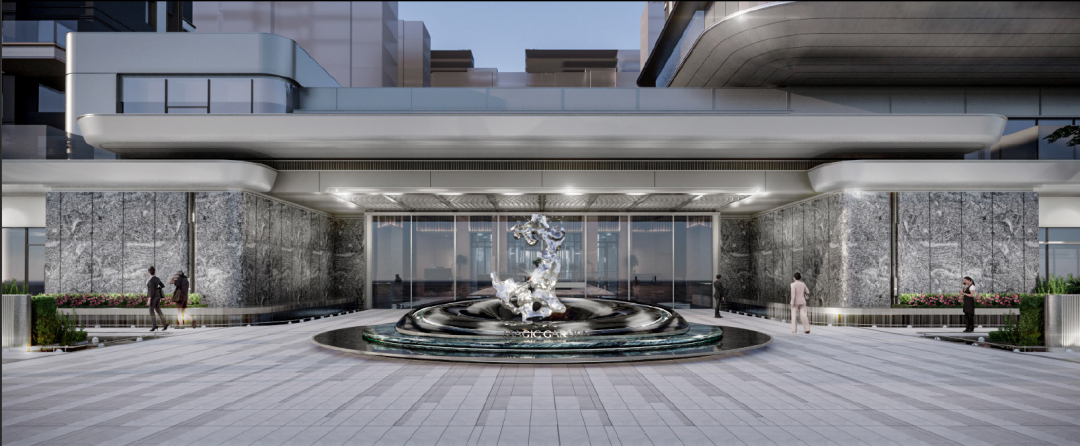 入口通过前区开放园林的氛围烘托、酒店式落客区融汇了灞河潺潺之形的曲面建筑,呈现生活的仪式感和服务感。