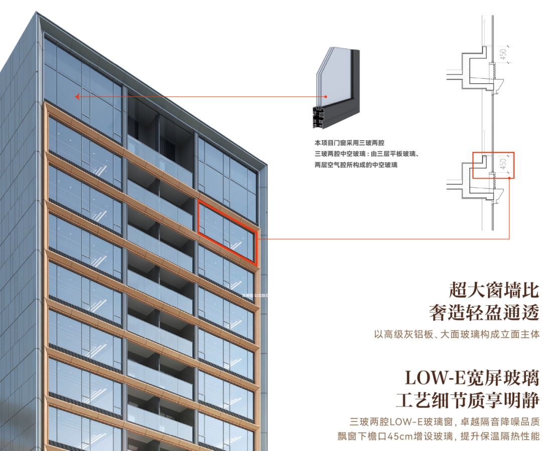 深灰色铝板与深灰色真石漆加深光影对比强化建筑体量,以整体的大面宽Low-e玻璃面提升建筑精致程度,打造公建化的立面品质。
