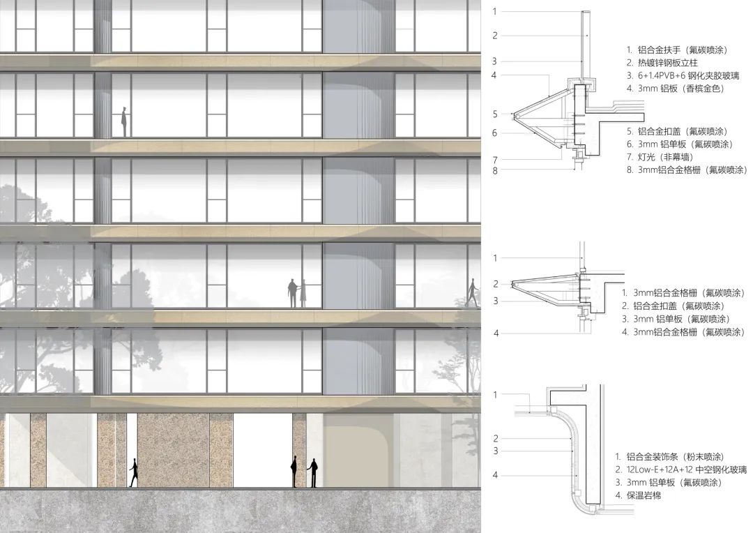 为凸显建筑轻盈灵动效果,建筑细节精雕细琢。在阳台部位,通过古铜色铝板斜面压边处理,提升线条层次感,营造内敛奢雅的气质。在飘窗构造中,出于立面整体性的考虑,采用玻璃外包飘窗窗台的方式,营造出落地窗的效果,进一步提升品质感。