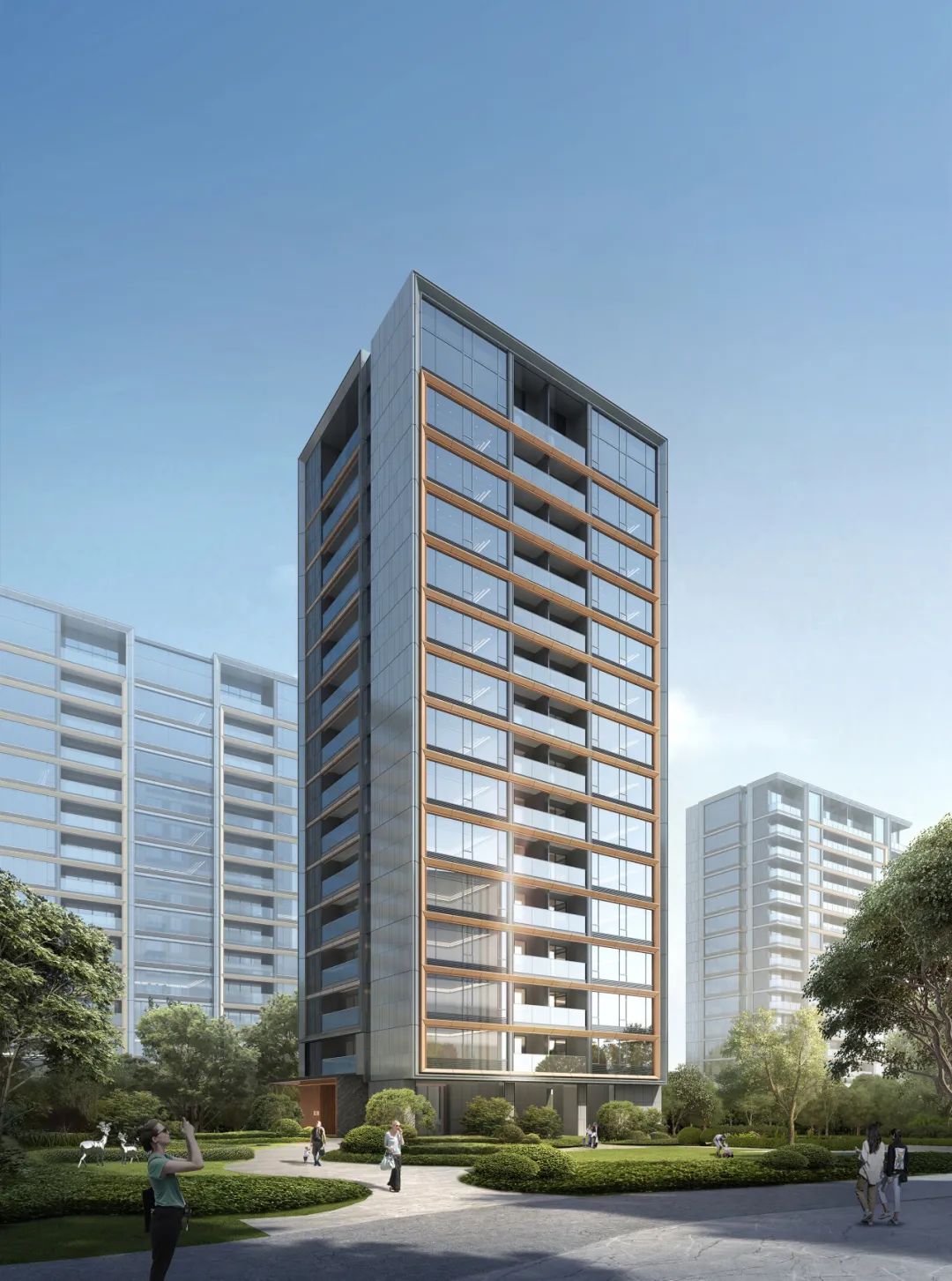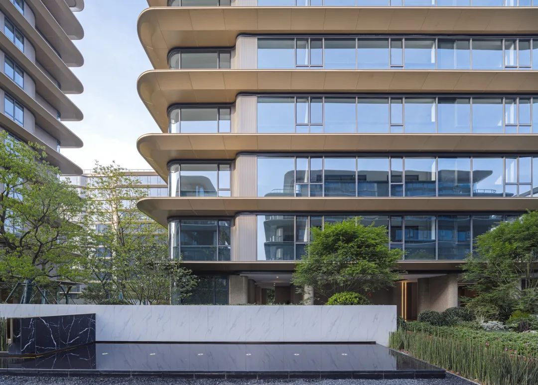 杭州武珹云府在立面窗墙比上,开启扇均遵循约0.382的黄金比例,赋予了立面恒定于时间的美感。同时将立面一体板升级为造价更高昂的干挂铝板(北立面部分涂料),搭配LOW-E宽屏钻感玻璃,让这一经典的比例感贯穿于建筑的每一面,在视觉上是延续一体的,仿佛是一片丝绸包裹在建筑上。