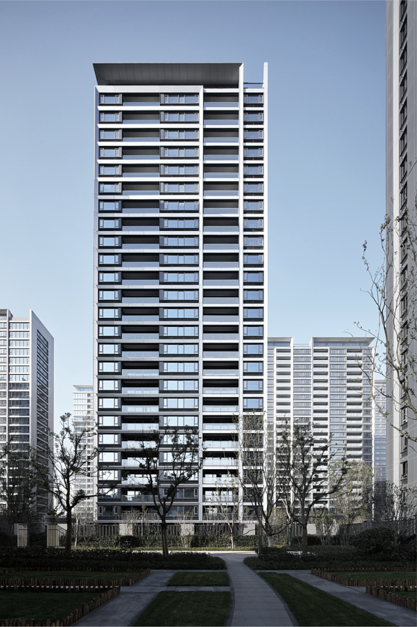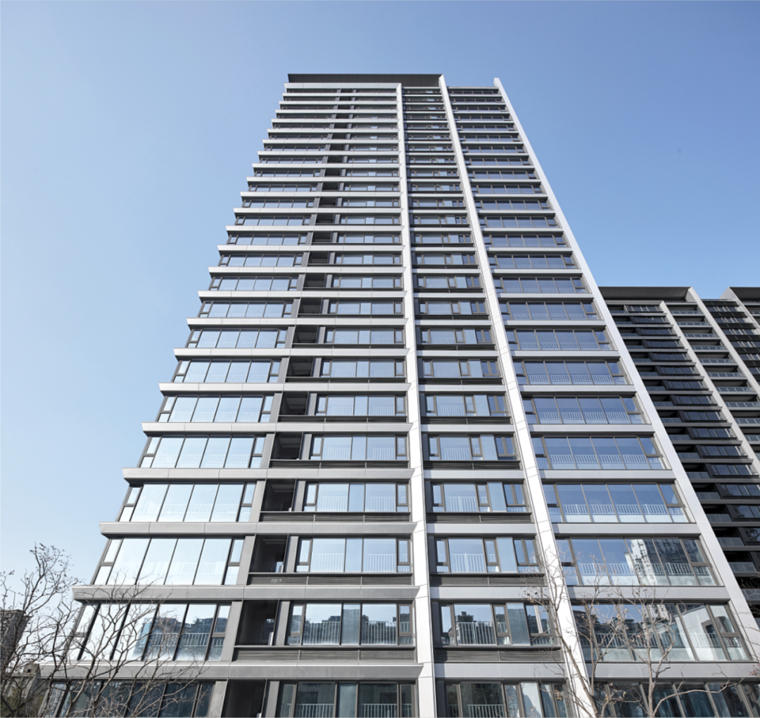 简洁有力的“L”型铝板线条,以合理的比例分割了整栋建筑,形成了建筑的基本框架。以“L”型框架为母题,在各种楼型中寻求与之契合的分割比例;非对称的形制,落在多楼型的建筑群中,构成一个个充满序列感的超流线造型,使整个立面拥有一种独特的统一感,而这便是建筑师探求的新的“秩序”。