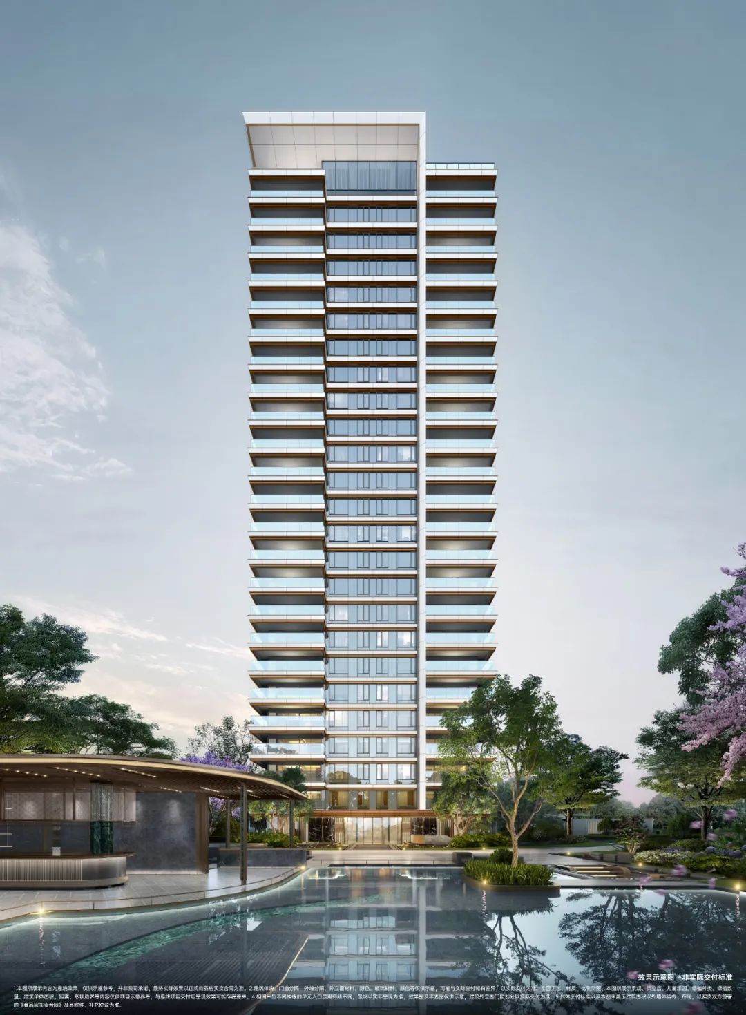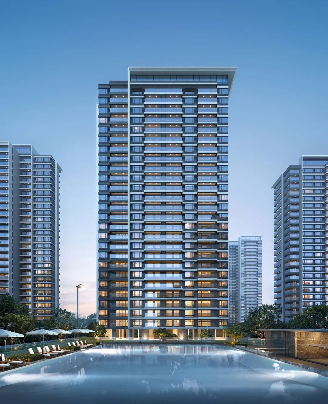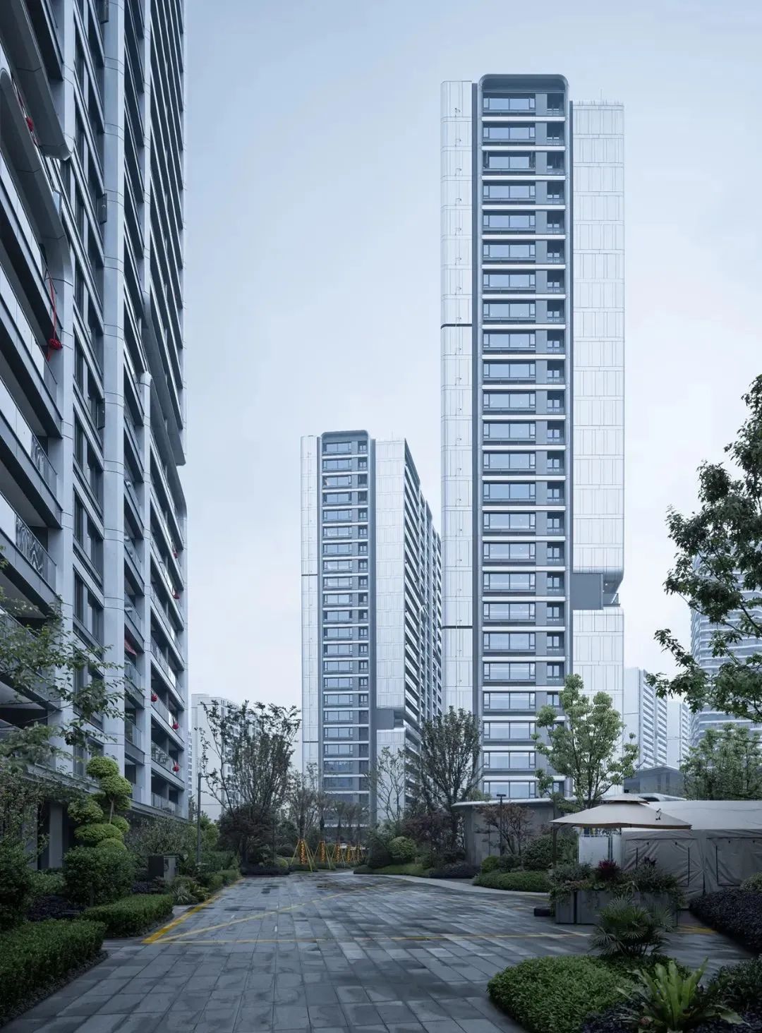锦江府项目通过简洁有力的标志性L型框架折板造型,以合理的比例分割了整栋建筑,形成「非对称」立面秩序,展现出与众不同的高级感与超强辨识度。