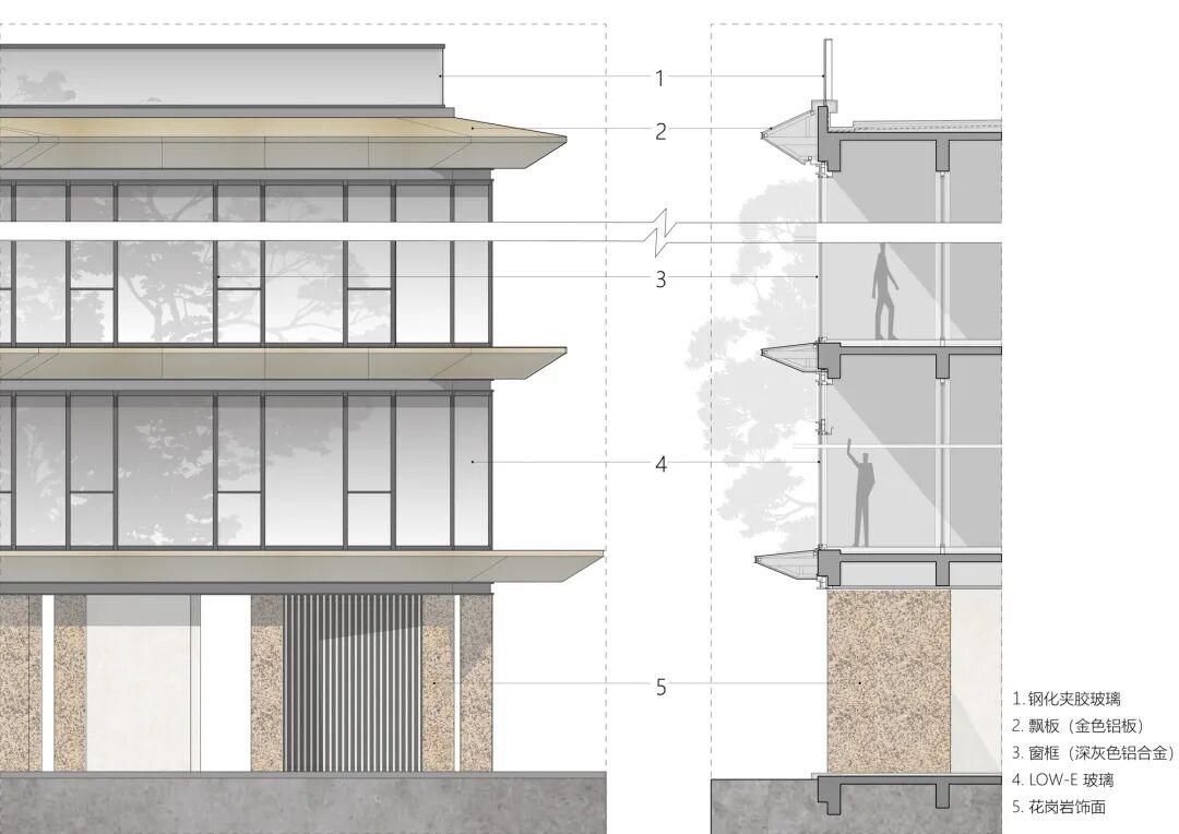 挑檐厚度仅45厘米,进深最大约2000厘米,通过控制飘板的形态大小可以更加合理地运用自然光,避免阳光直射,并通过在上表面做约5%的坡度帮助排水,增加铝板的自洁性。