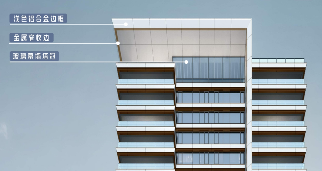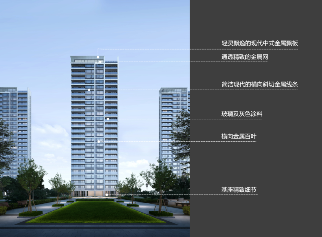 简洁现代的横向斜切金属铝板线脚高750mm,呈现清晰明朗的建筑轮廓;轻灵飘逸的中式金属铝板飘顶出挑2200mm甚至更远,在简洁现代的形体基调下令人眼前一亮;基座造型大气,其大尺度雨棚通过斜切手法和铝板细节在近人尺度提升建筑精致程度,彰显项目尊贵品质。
