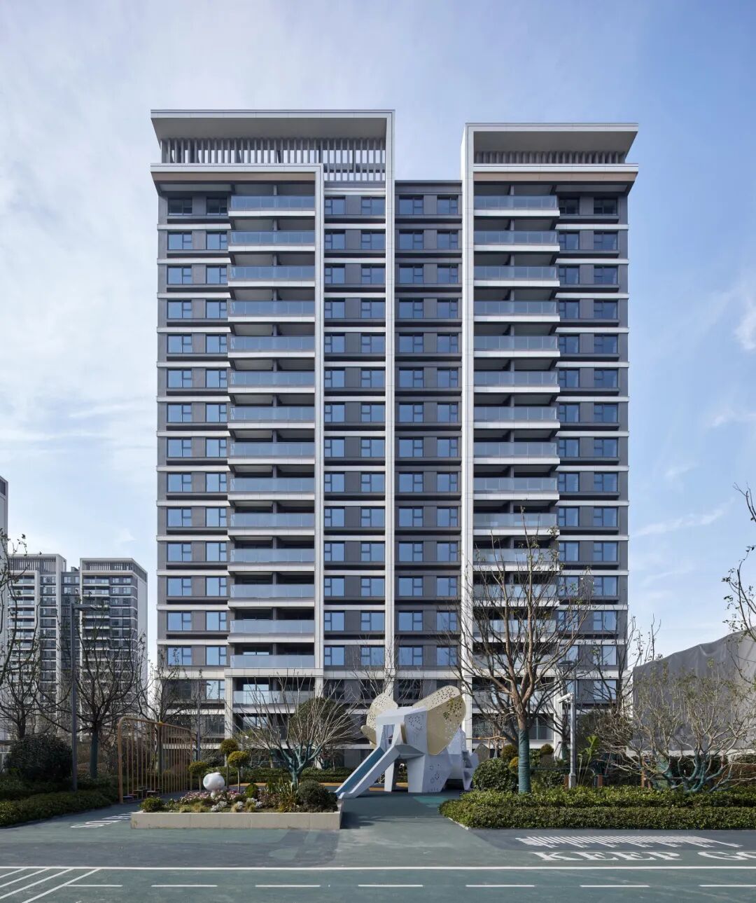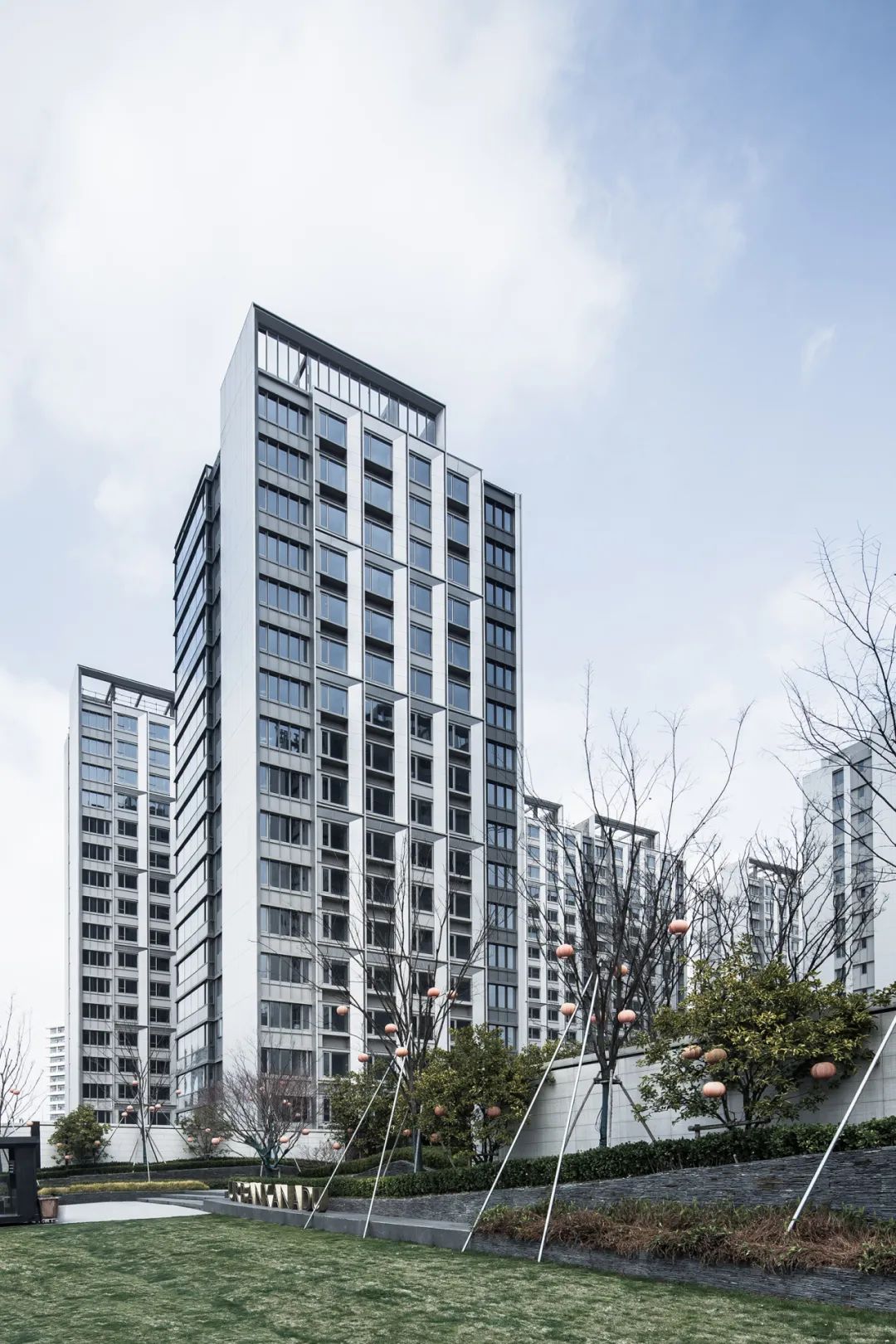 绿城凤栖鹭鸣邸项目北区的高层住宅着重延续宋式民居的线条感,以横向铝板斜切的手法,削弱建筑体量,形成严谨且创新的不对称立面秩序;转角阳台与阳角同样以灰色金属铝板利落收边,边缘处流畅、动感的圆角曲线,强调超流体建筑的反重力感。