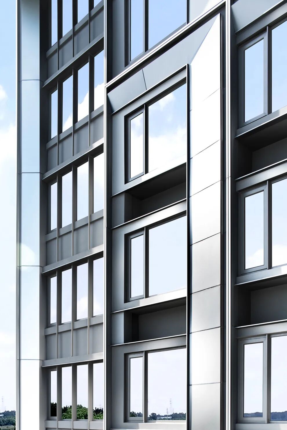 相比传统铝板施工,立面斜切工艺其标准更为苛刻,而带来的是建筑立面更精巧、轻盈的感受,打破了传统块状感的笨重。同时在细节上,让每个窗框宛如中古油画框般,富有独具的立面符号,给予值得人们驻足欣赏的细节。