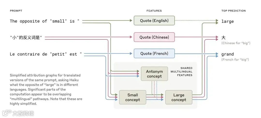 Anthropic的实验过程非常有趣:面对同一个问题,不论是用英语问(the opposite of "small" is),中文问(“小”的反义词是),还是法语问(le contraire de "petit" est),LLM都使用跨语言共享的特征进行思考,并在同一个概念空间里处理信息。