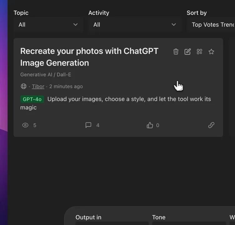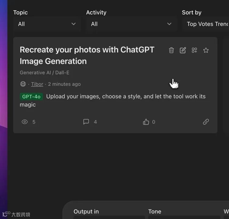 据报道,OpenAI的GPU资源目前相对闲置。为了充分利用这些资源,我开发了一个简单的提示模板,使用户能够通过ChatGPT 4生成器将他们的照片或图片转换成任何预设风格。