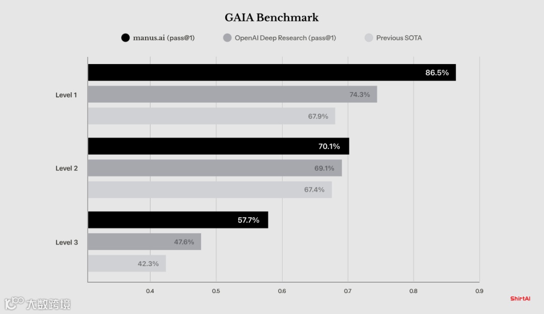 Manus在GAIA Benchmark上的表现令人瞩目,它在三个难度级别上均超越了OpenAI Deep Research。这一成就不仅证明了Manus在算法优化和数据处理上的卓越能力,也展示了其在解决复杂问题上的强大潜力。