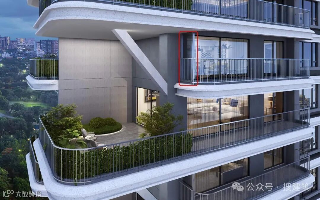 比如福州国贸天琴樾,在檐口利用飘窗设计进深为600mm雨棚隐私挡板,很大程度规避了奇偶户型之间的视线干扰,更好地保障隐私。