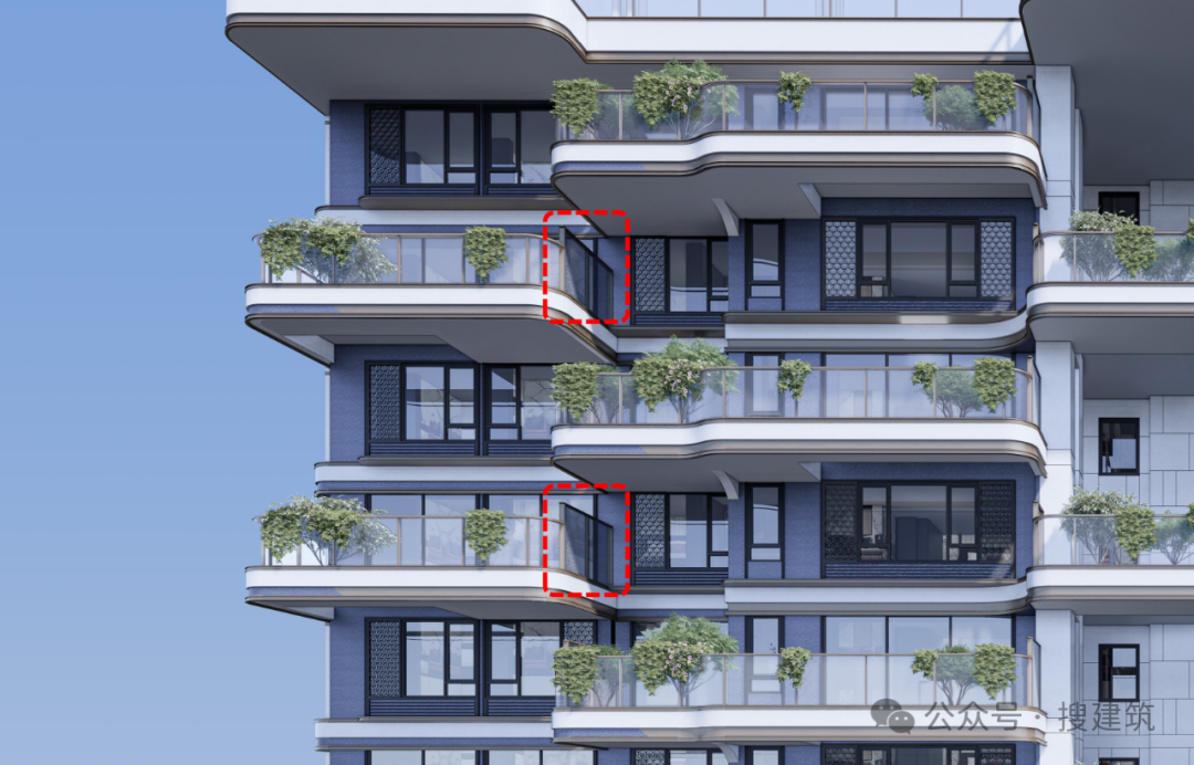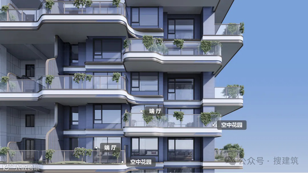 西安中铁建西派玺悦针对奇偶错层阳台设计容易导致两户对视的私密性问题,项目在奇偶错层位置创新设计“造型墙”提升私密性,S型流体美学立面,不仅有效解决了当前多数“第四代住宅”在露台私密性方面的常见问题,也丰富了建筑的视觉美感。