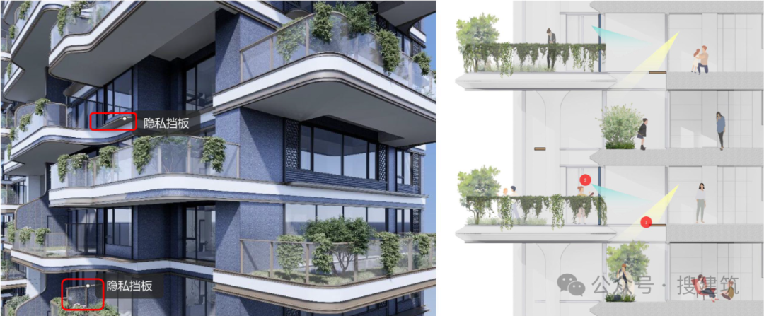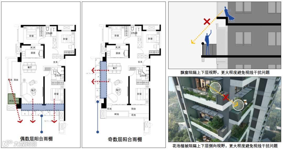 第四代住宅均存在奇偶层设计差异,导致空中花园存在:卧室与阳台(上下视线)、阳台与阳台(左右视线),对视情况,目前有效设计手法主要有:增加水平雨棚、竖向挡板两种方式。