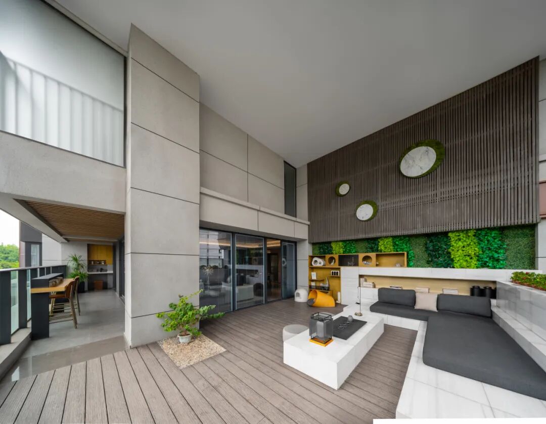 露台私密性上优化升级,露台侧方设计隐私挡板,南北向、奇偶错层挑高布置共享式超尺度露台,对户内完全无遮挡,兼顾私密性与采光的同时令居住的功能和场景更为多元化,最大化实现生态住宅的花园生活。