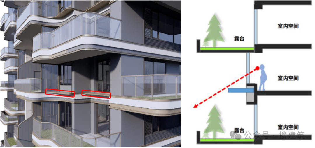 空中花园为奇偶层水平交错式布置,会导致上层业主从左右侧面水平方向看到下层业主的花园。