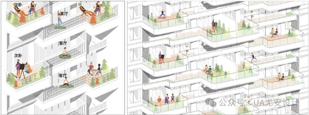 可以将景观绿植外置,靠近露台边缘,或围绕着露台周长布置,可以将功能性露台尽量内置,限定人停留、活动的区域,有效规避不同户之间视线交叉的问题。